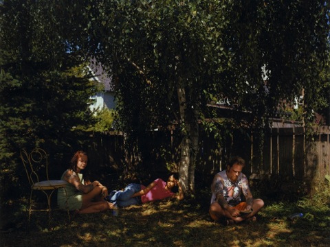 This image was made a year after Wall first saw it. There’s a different tree, fewer people, different people. But in his re-creation, Wall enhanced what’s powerful about this image — the temporary pattern of the light laid atop the permanent, inked patterns on his subjects’ skin.