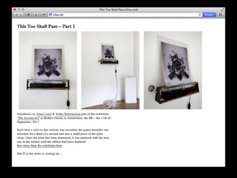 This work was included in a group exhibition about photography and performance called The Second Act. A photographic print has been placed on a shelf attached to a shredder. When someone visits the website for the project, the shredder is activated for a third of a second. After enough visits, the entire edition is destroyed.