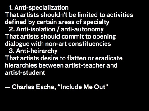 There’s a very smart curator named Charles Esche who’s the director of the Van Abbemuseum in Holland, and he wrote an article that went back and looked at the history of avant-garde art programs along with documents about how artists should be educated. There were a lot of disagreements in those documents, but he found three common threads.