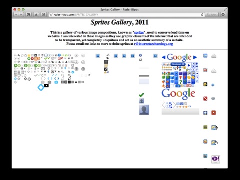 Online, removal as a strategy translates just as well. This gallery of internet sprites by the artist and OKFocus cofounder Ryder Ripps takes the sheets of tiny image sprites used by services like Twitter and GMail and archives them. The sprite sheets were created to speed up the sites by reducing calls to the server for small images. But in removing them from their original context, Ripps presents the sprites in another way. These tiny images organize and spatialize the way we interact with these powerful platforms. What’s allowed, what’s encouraged, the color and shape of selection and refusal — they are all contained here. Ripps’s work has found a huge audience online, and it’s this unbuilding process that gives it much of its force.